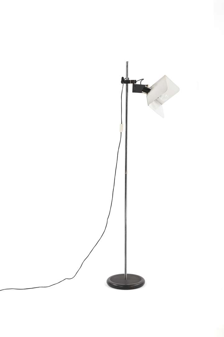 A floor lamp, chrome-plated metal stem, white lacquered metal refector, black plastic base. Producer's label.