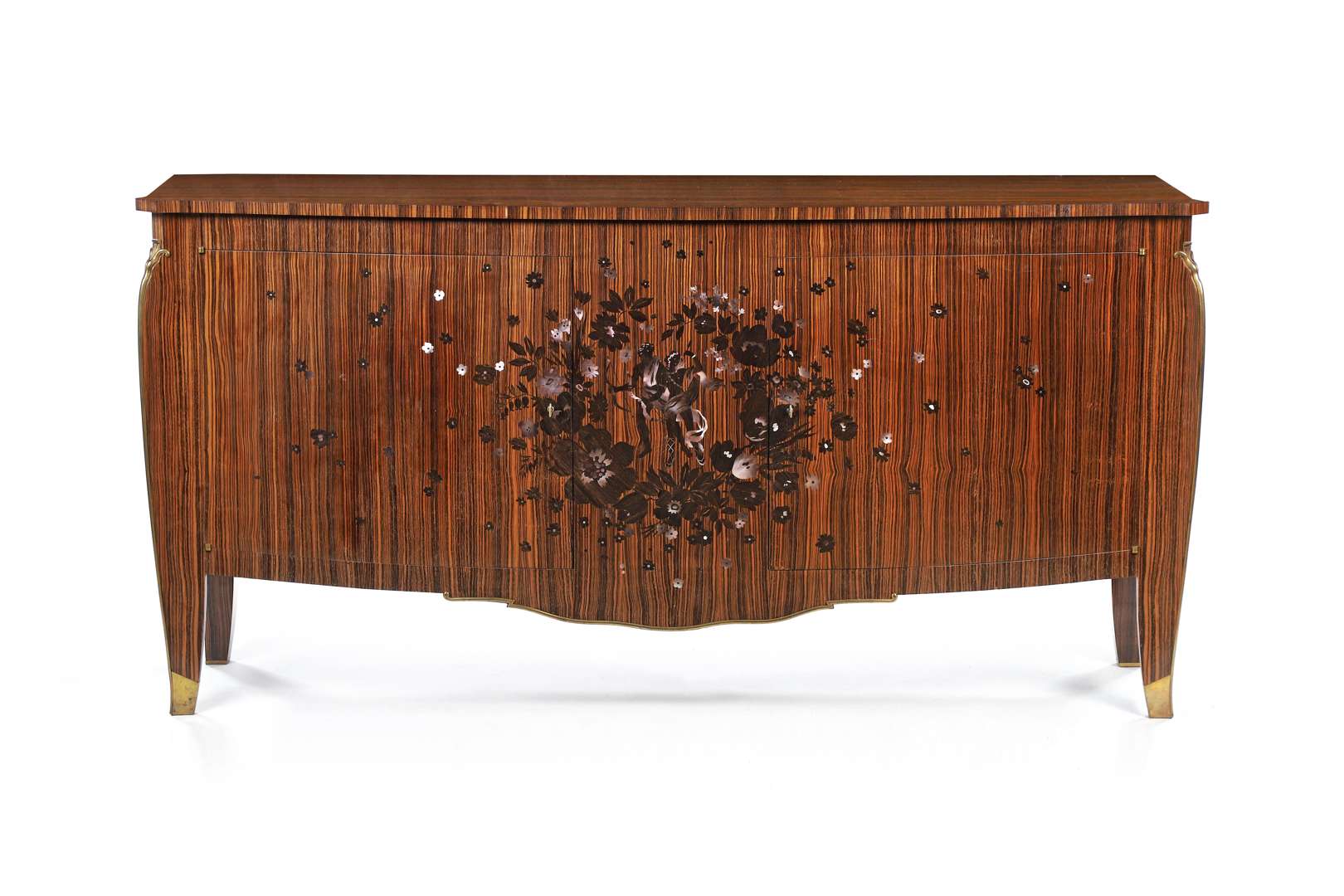 A large sideboard, 1938, Makassar ebony veneer, gilt bronze feet and fillets, mother-of-pearl and ebony inlaid decoration, interior in sycamore veneer. Cartouche.