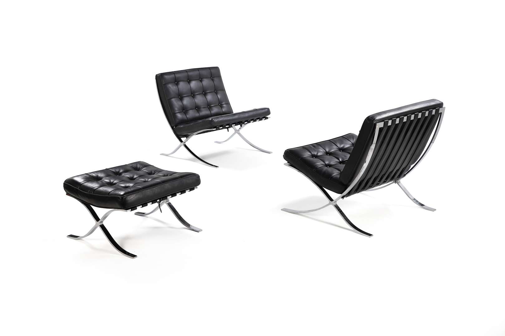 A pair of ‘Barcelona' low chairs and one ottoman, model designed in 1929, chromed steel structure, black leather straps, black leather upholstered seat and back cushions.