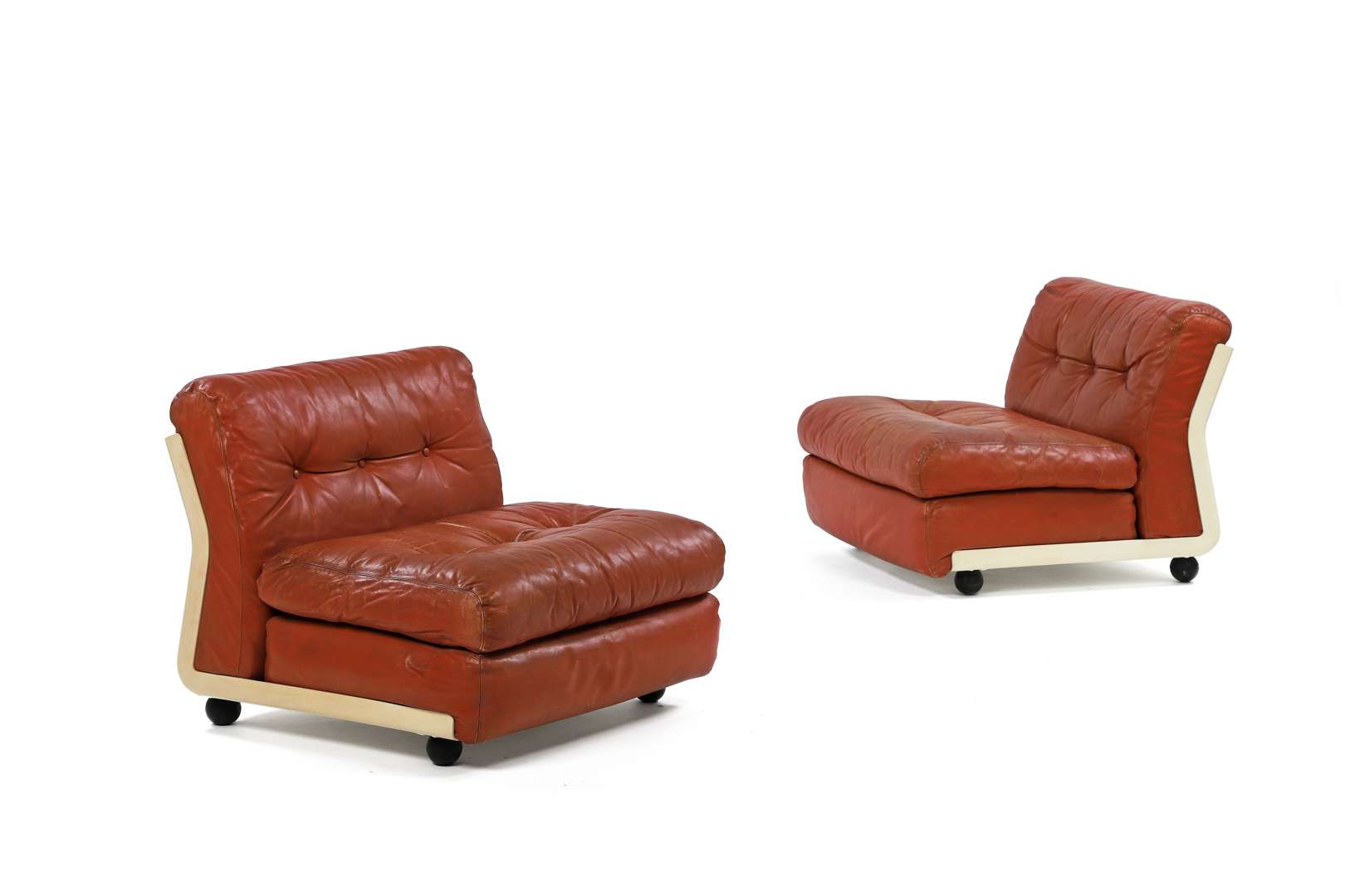 A pair of armchairs, ‘model Amanta' designed in 1966, white ABS structure, seat and backrest cushions filled with foam covered with brown leather, black plastic feet.