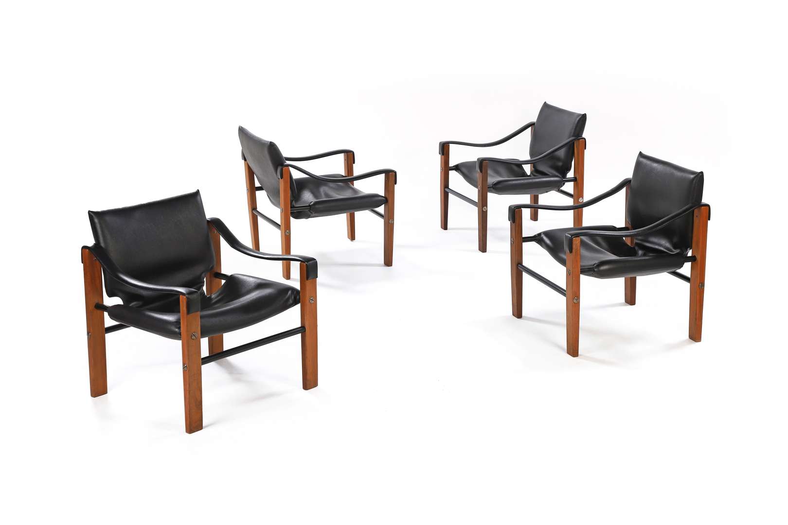 A set of 4 armchairs, model 'Chelsea', c. 1970, teak structure, black lacquered metal crossbars, black leatherette seat, backrest and armrests. Producer's stamps.