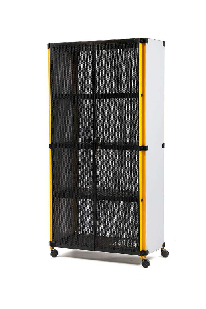 A cabinet, c. 1977, yellow lacquered steel and white melamine structure, black lacquered perforated metal shelves, black melamine back, on wheels.