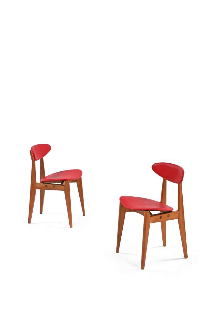 A pair of chairs, model 'Ellipse' designed in 1958, beechwood structure, seat and backrest covered with red leatherette.