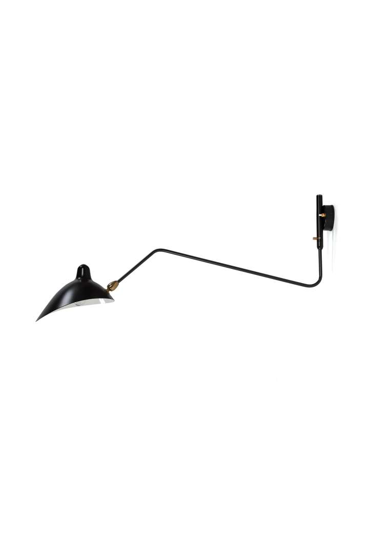 A single-arm wall light, black lacquered steel structure, black lacquered sheet metal reflector, white lacquered on the inside, brass ball joint.