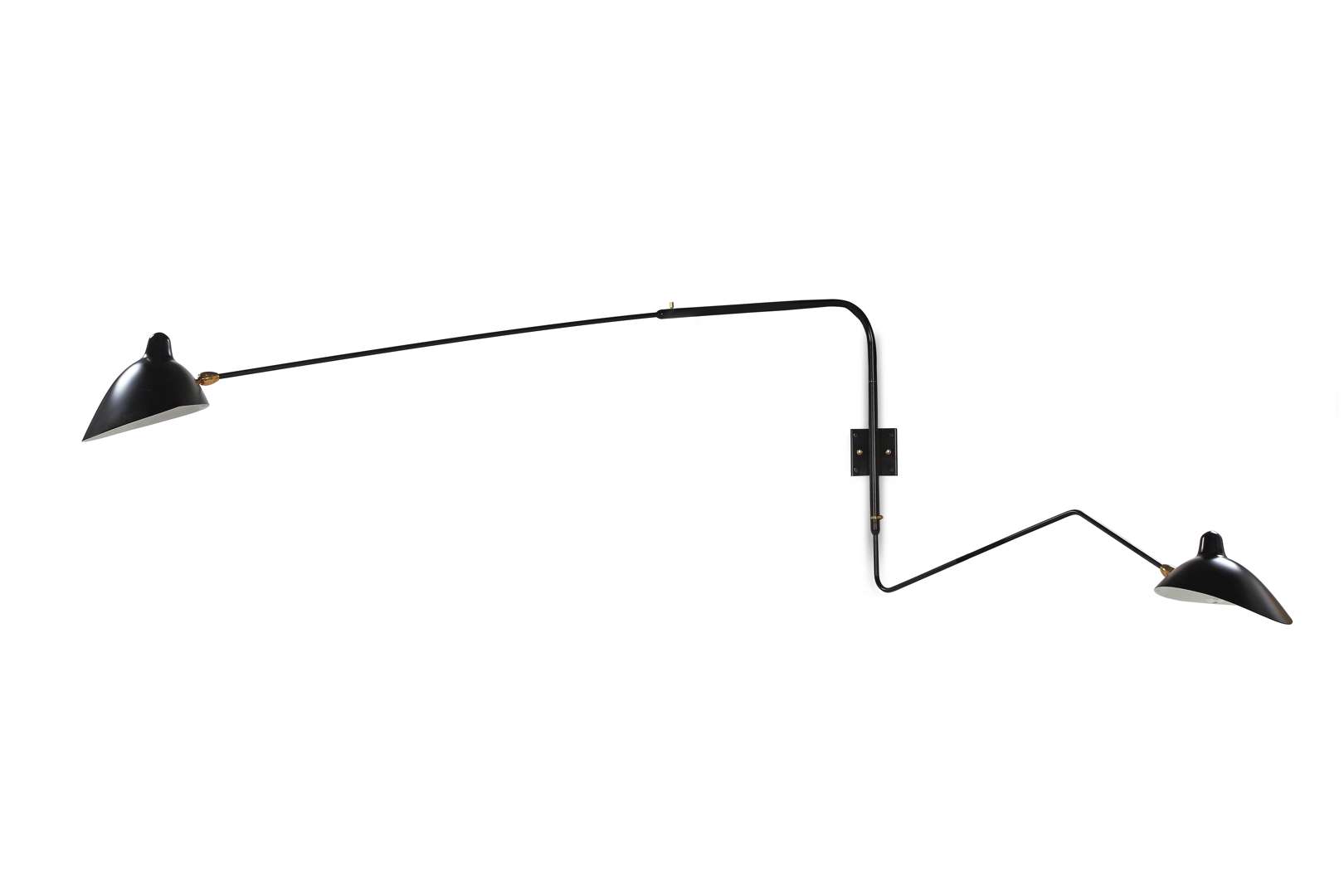 A wall lamp, model 'Coudée à deux bras pivotants' designed in 1954, black lacquered steel structure, black lacquered sheet metal reflector, white lacquered on the inside, brass ball joint.