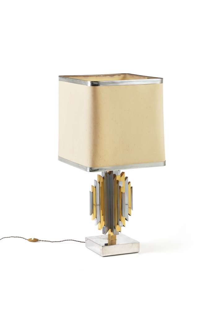 En métal chromé et laiton doré, à décor géométrique, abat-jour quadrangulaire en coton écru bordé de deux bandes en pourtour à l'imitation du métal, base carrée en métal chromé.