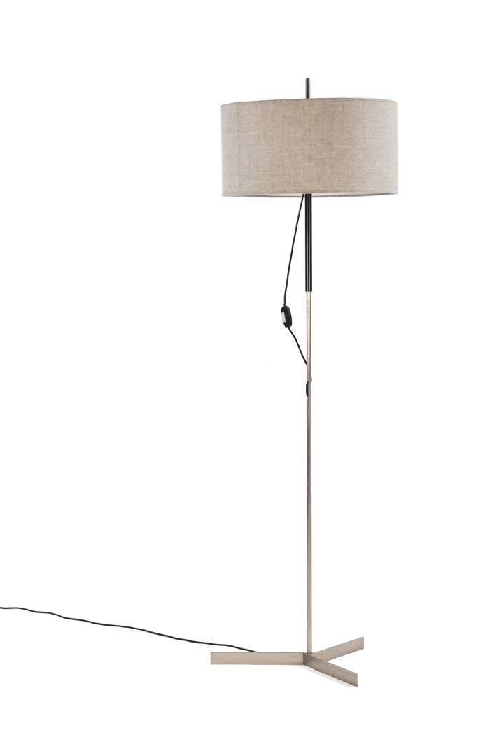 Fût en métal brossé et métal laqué noir, reposant sur une base tripode, abat-jour postérieur en lin greige.