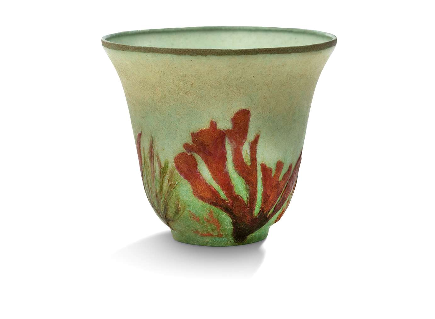 En pâte de verre, poudres d'émaux rouges sur fond vert d'eau, à décor estampé d'algues et plantes aquatiques. Cachet circulaire ‘Dammouse’.