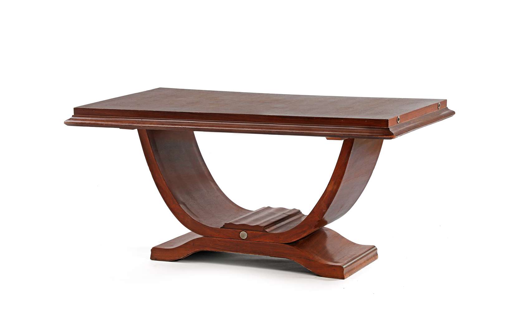 En acajou, épais plateau rectangulaire pouvant accueillir latéralement deux allonges, surmontant un arc de cercle, reposant sur une base en doucine, jonc, pastille et anneaux en métal.