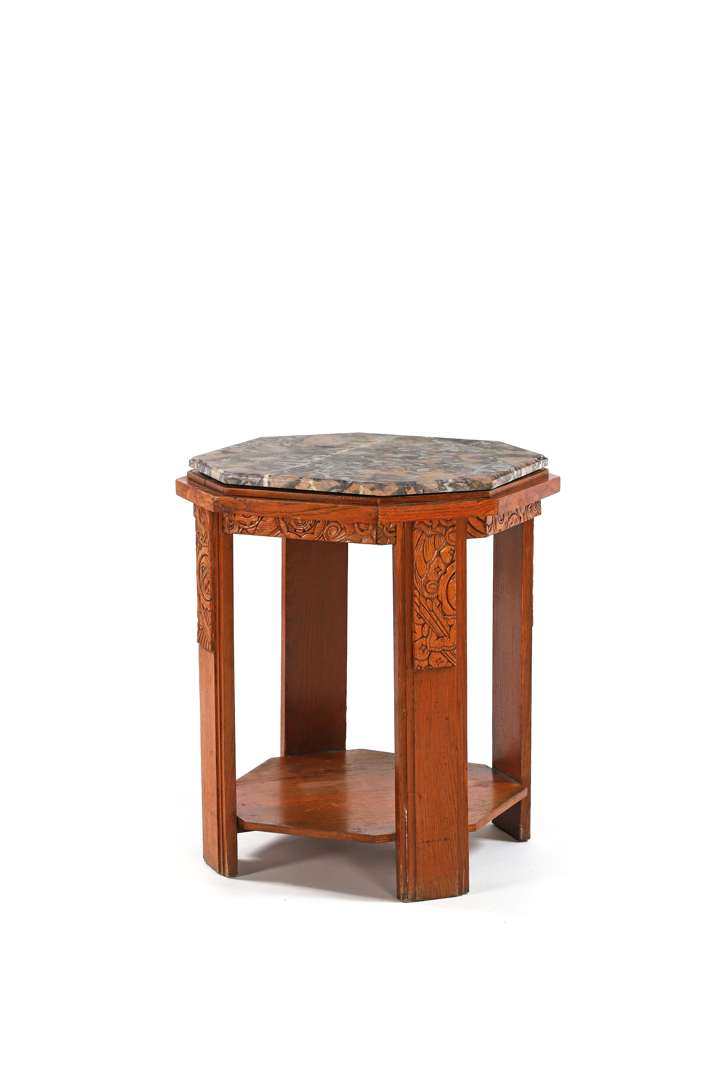 Structure en chêne, à décor sculpté de fleurs stylisées, reposant sur un piètement quadripode réuni par une tablette d'entretoise, plateau octogonal en marbre gris veiné.