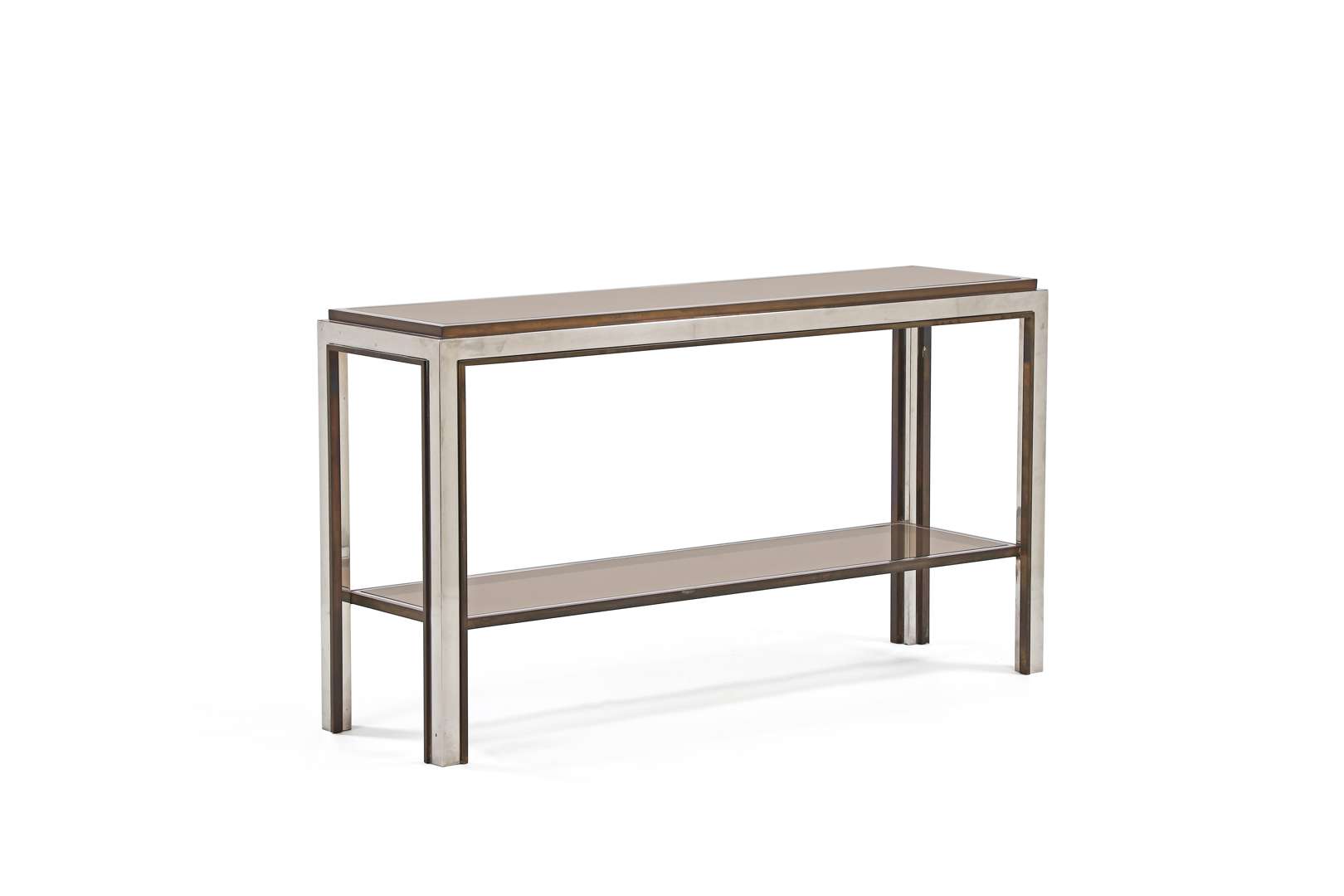 Structure en acier et laiton, soutenant deux plateaux rectangulaires en verre fumé.