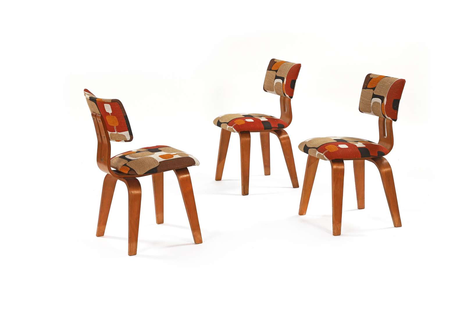 Structure en bois massif, assise et dossier garnis de mousse recouverte postérieurement de lin à motifs abstraits bruns, jaunes et rouille.