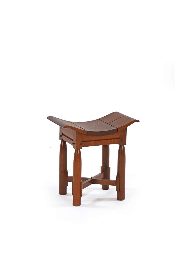 Structure en chêne, assise curule composée d'un quadrillage en cinq parties, surmontant une ceinture à clavettes, reposant sur quatre pieds en obus réunis par une entretoise en X. Estampillé au fer à chaud ‘Ch.D’.