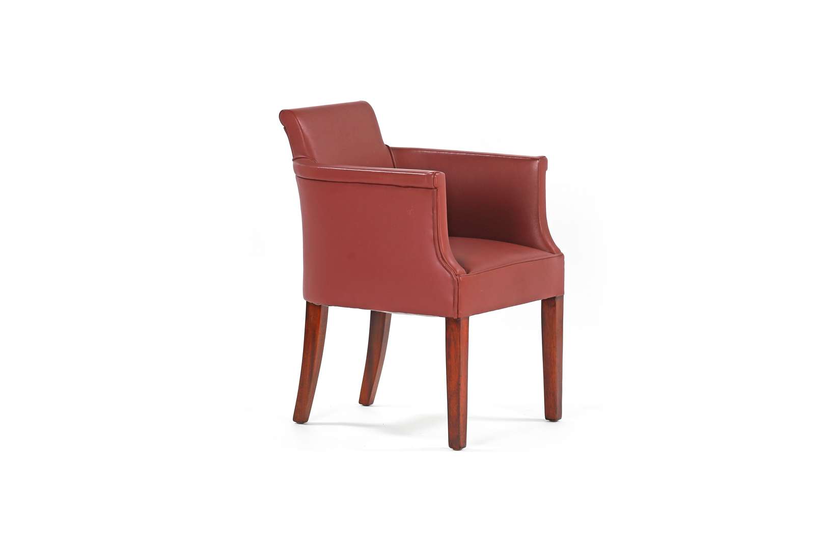 Structure en bois, garniture postérieure en cuir bordeaux, reposant sur des pieds gaine à l'avant et des pieds sabre à l'arrière.
