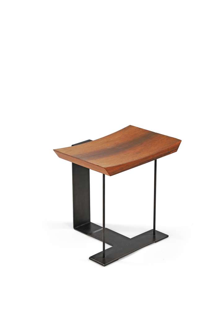 Issu de la période dite "Bois-métal", l'une des plus abouties de l'œuvre de Pierre Chareau, le Tabouret ‘T’ est une création emblématique du designer français, réalisée en collaboration avec le ferronnier d'art Louis Dalbet. Cette pièce a été intégrée à de nombreux projets d'aménagement, parmi lesquels l'iconique Maison de Verre (1928-1931).