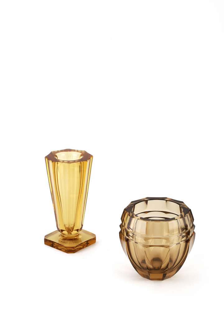 En verre teinté jaune et ambré, deux à pans coupés, le troisième à fond givré.