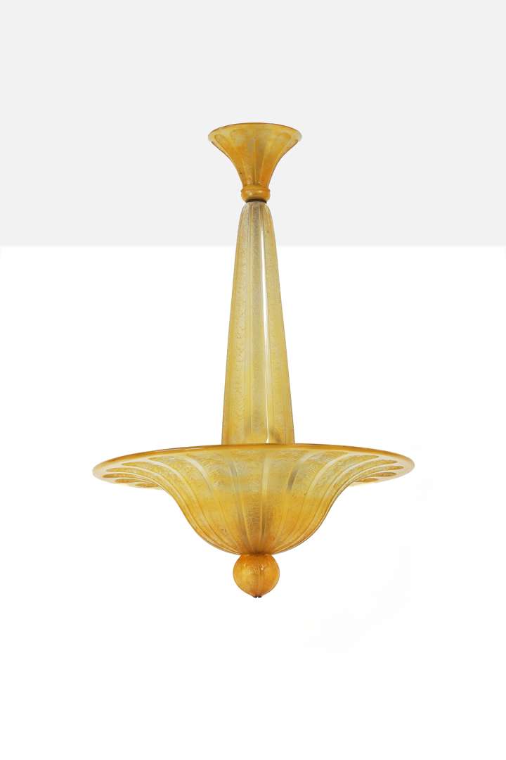 En verre épais teinté jaune, le fût fuselé, cache bélière évasé, vasque conique à décor gravé à l’acide de motifs géométriques rayonnants sur fond givré. Signature incisée ‘Daum Nancy France’.