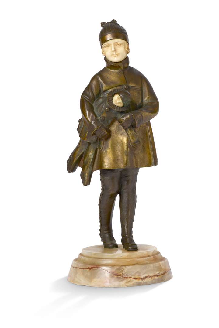 En bronze à patine mordorée et ivoire, représentant une jeune fille tenant un Pierrot dans ses bras.
