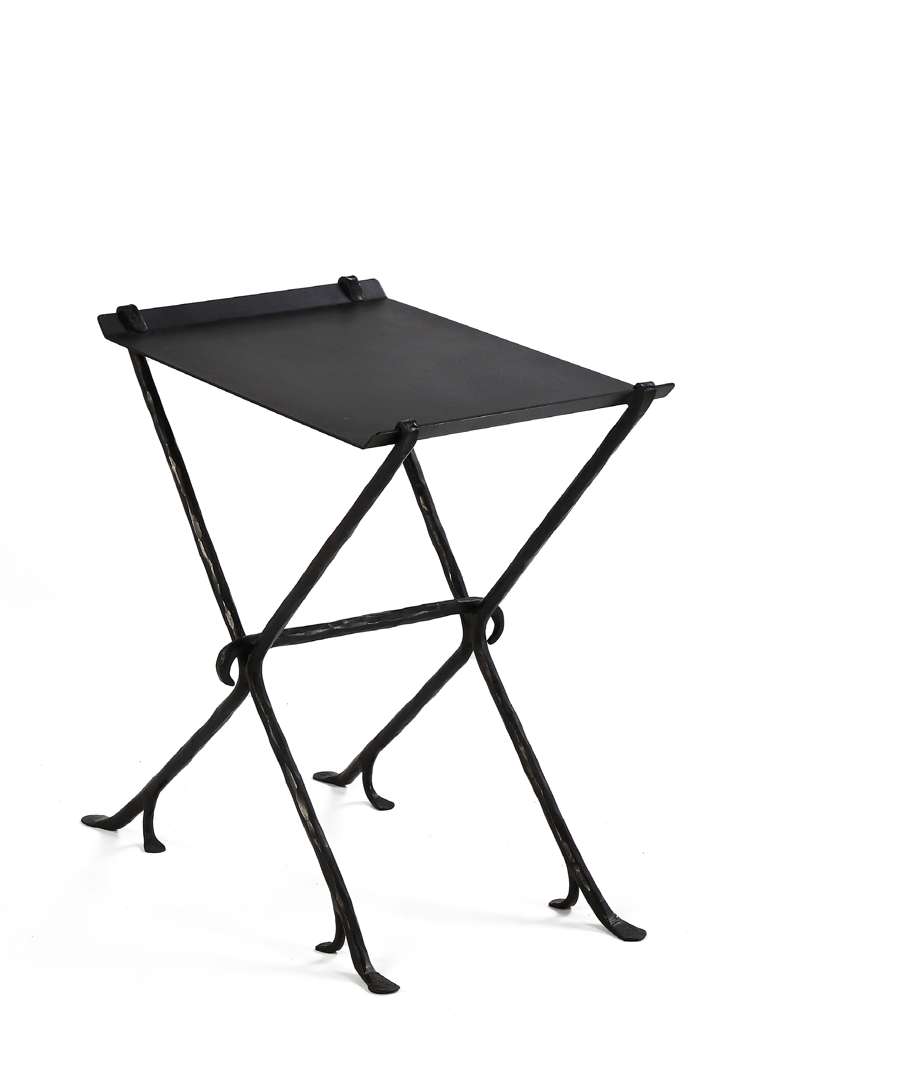 Piétement en X en fer battu, soutenant un plateau en fer oxydé à patine noire et brune.
