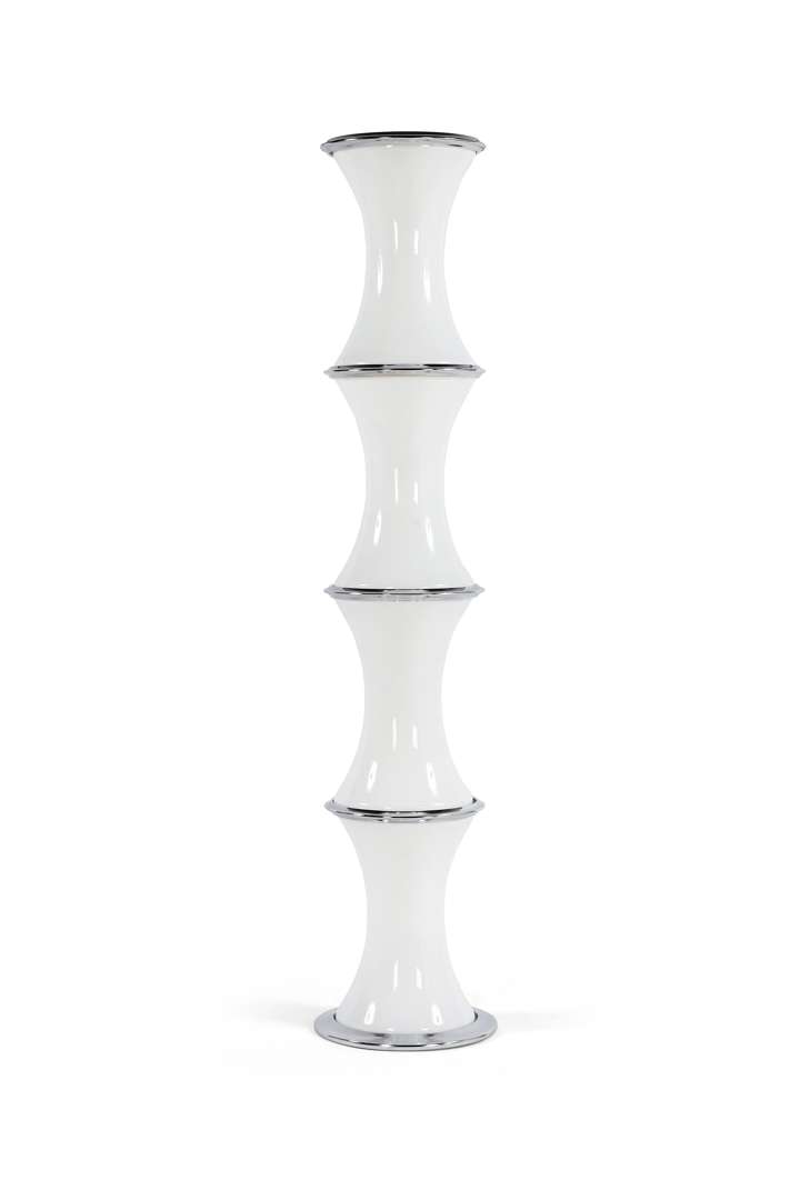 Déflecteur composé de quatre sections concaves superposées en verre opalin, retenues entre elles par des anneaux en métal chromé.