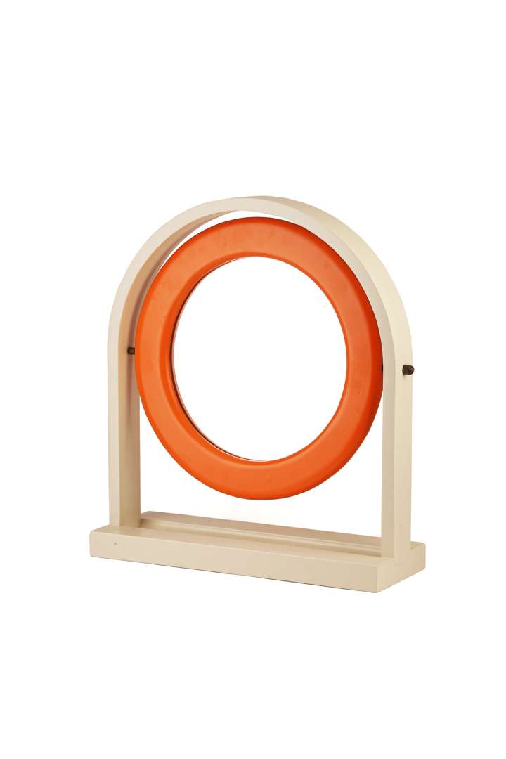 Structure en bois laqué blanc, retenant le cadre circulaire inclinable en bois laqué orange.