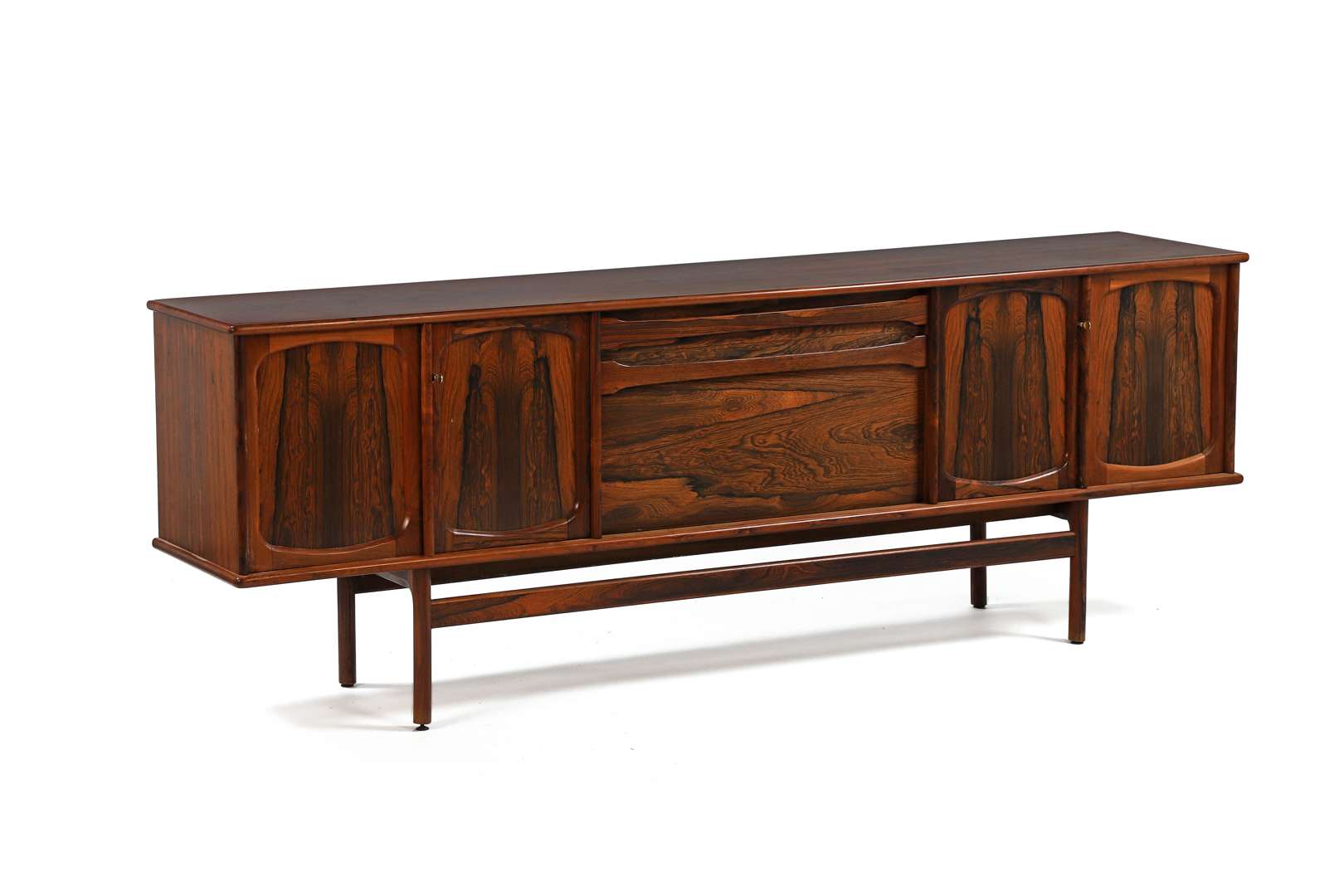 En palissandre et placage de palissandre, ouvrant en façade par deux paires de vantaux découvrant chacune un intérieur muni d’un tiroir supérieur et d’une étagère, encadrant en partie centrale un tiroir supérieur et un abattant découvrant un intérieur formant bar, reposant sur un piétement quadripode ovalisé réuni par deux entretoises. Étiquette du designer et de l’éditeur.