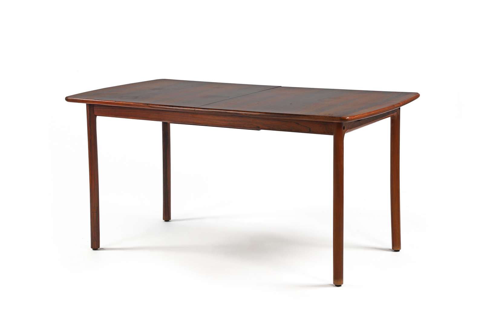 En palissandre et placage de palissandre verni d'origine, le plateau rectangulaire muni d'une allonge, reposant sur un piètement quadripode cylindrique.