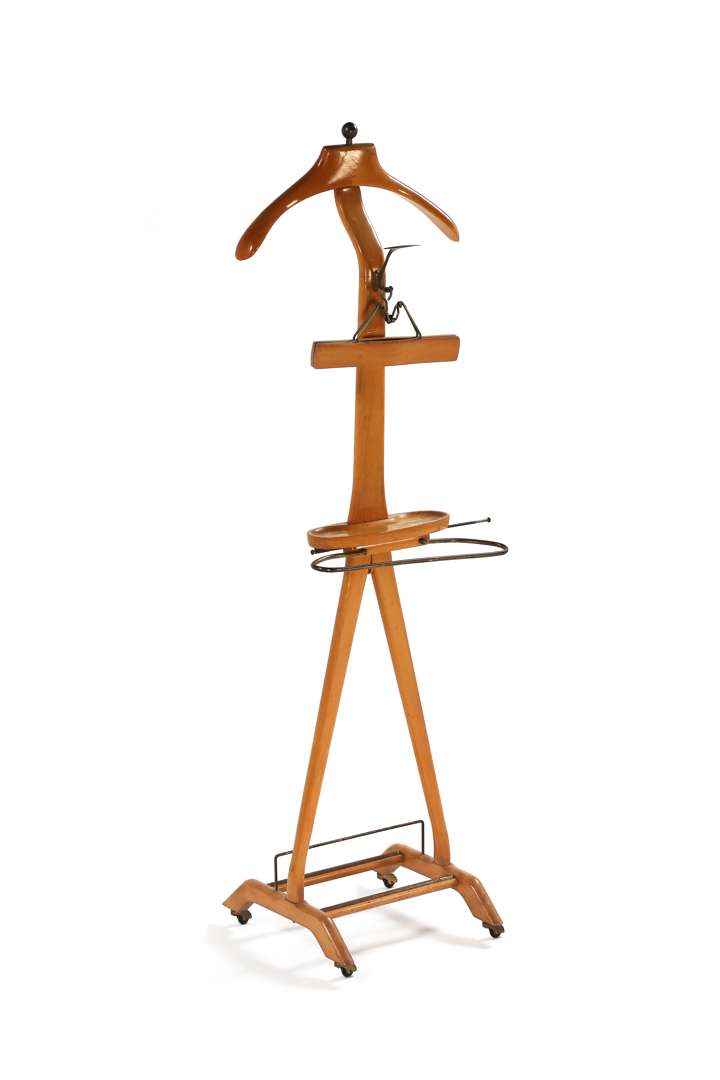 En hêtre verni et laiton, reposant sur un piètement sur roulettes.