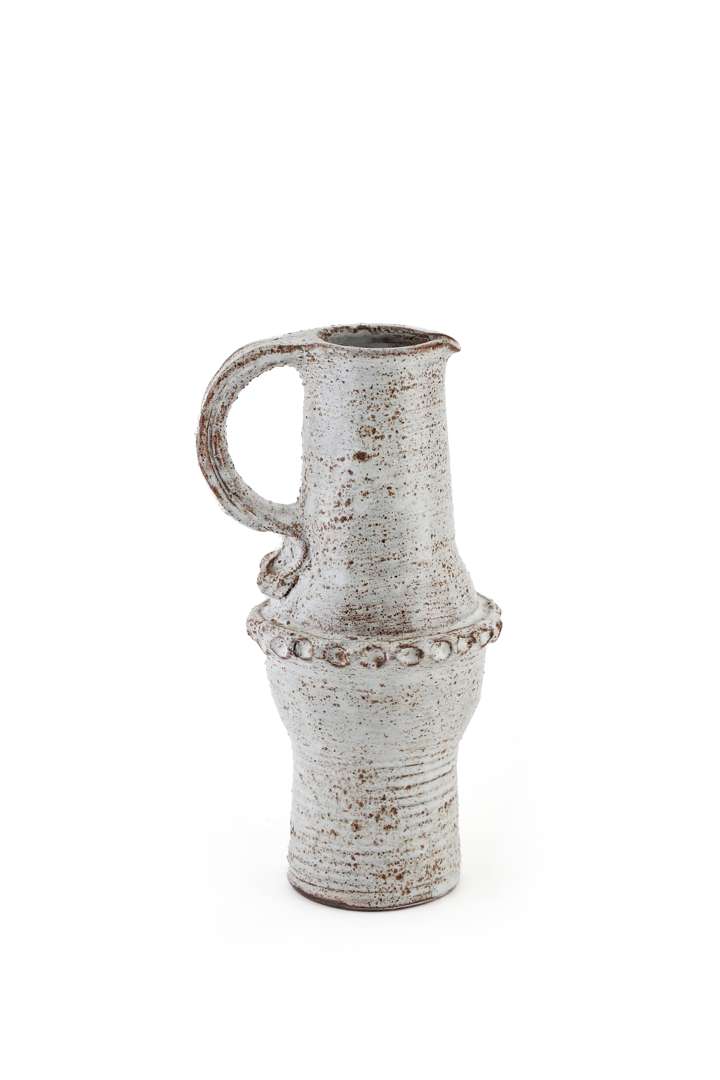 En faïence émaillée beige et gris, panse renflée animée d'une frise de pastille estampées.