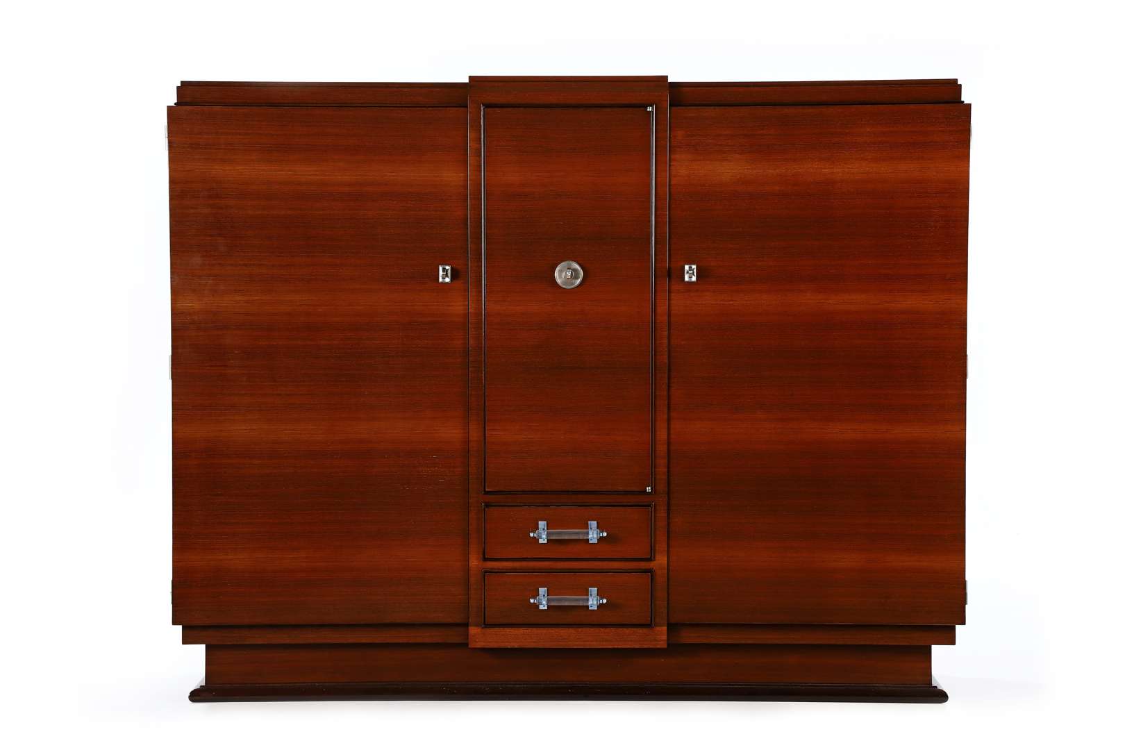 Structure parallélépipédique en placage de palissandre, ouvrant en façade par trois vantaux découvrant des intérieurs munis d'étagères et par deux tiroirs inférieurs, poignées de tirage en verre, entrées de serrure en métal nickelé. Cartouche ‘J Leleu’, numéroté P15345.