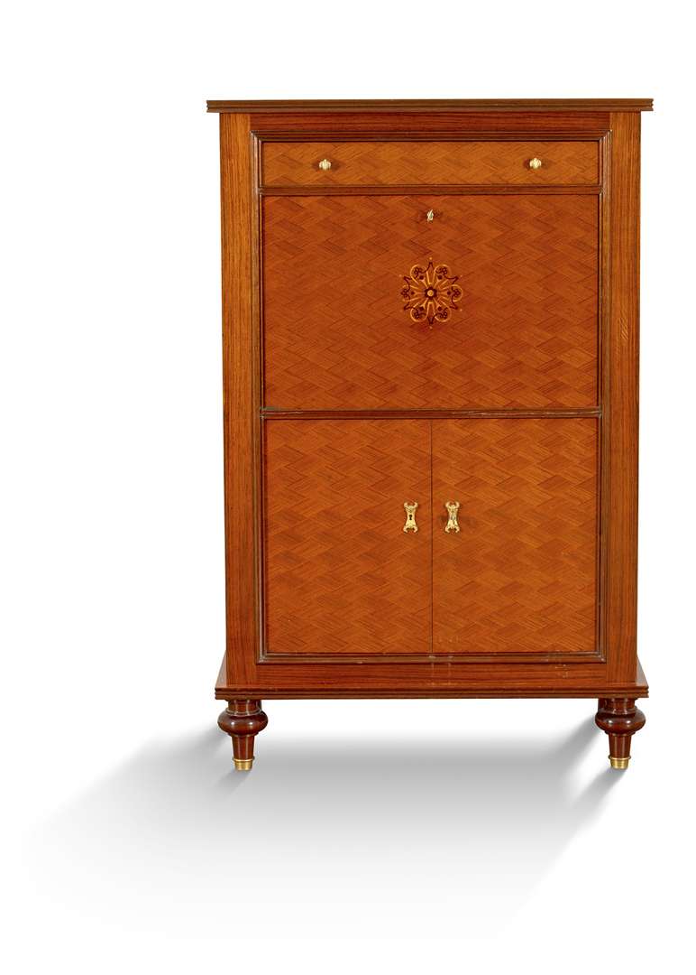 Structure en bois de placage de différentes essences reverni, la façade à décor marqueté de croisillons, ouvrant par un tiroir supérieur, un abattant orné au centre d'une rosace marquetée, gainé à l'intérieur de cuir brun, découvrant un intérieur rétro-éclairé en placage de sycomore muni de tiroirs et compartiments, deux vantaux inférieurs ouvrant sur un intérieur en placage de sycomore, prises et entrées de serrure en laiton, reposant sur des pieds toupies à l'avant et sabre à l'arrière. Étiquette de l'ébéniste, numéroté ‘27190’.