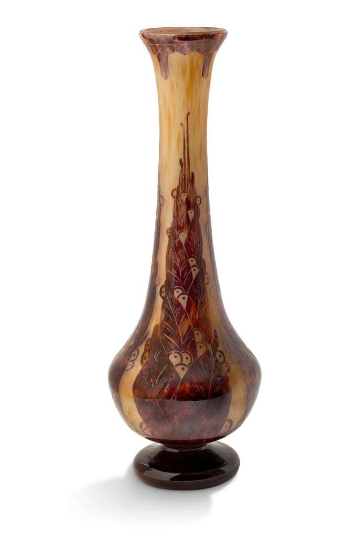 En verre multicouche pourpre sur fond marmoréen jaune et orange, à décor gravé à l'acide de lauriers stylisés sur la panse et d'une frise géométrique au col, reprise des nervures à la roue. Signature incisée ‘Le Verre Français'.