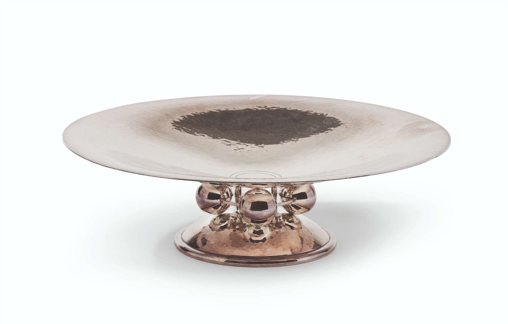 En métal argenté martelé, reposant sur une base circulaire bombée surmontée d’un piédouche composé de 4 sphères.