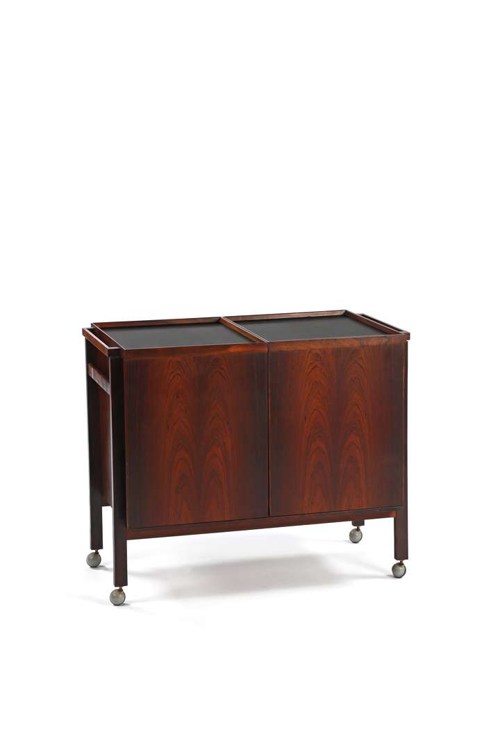 Structure en palissandre, corps quadrangulaire coulissant ouvrant sur un intérieur découvrant des compartiments en formica blanc et verre, plateau en formica noir, piétement sur roulettes.