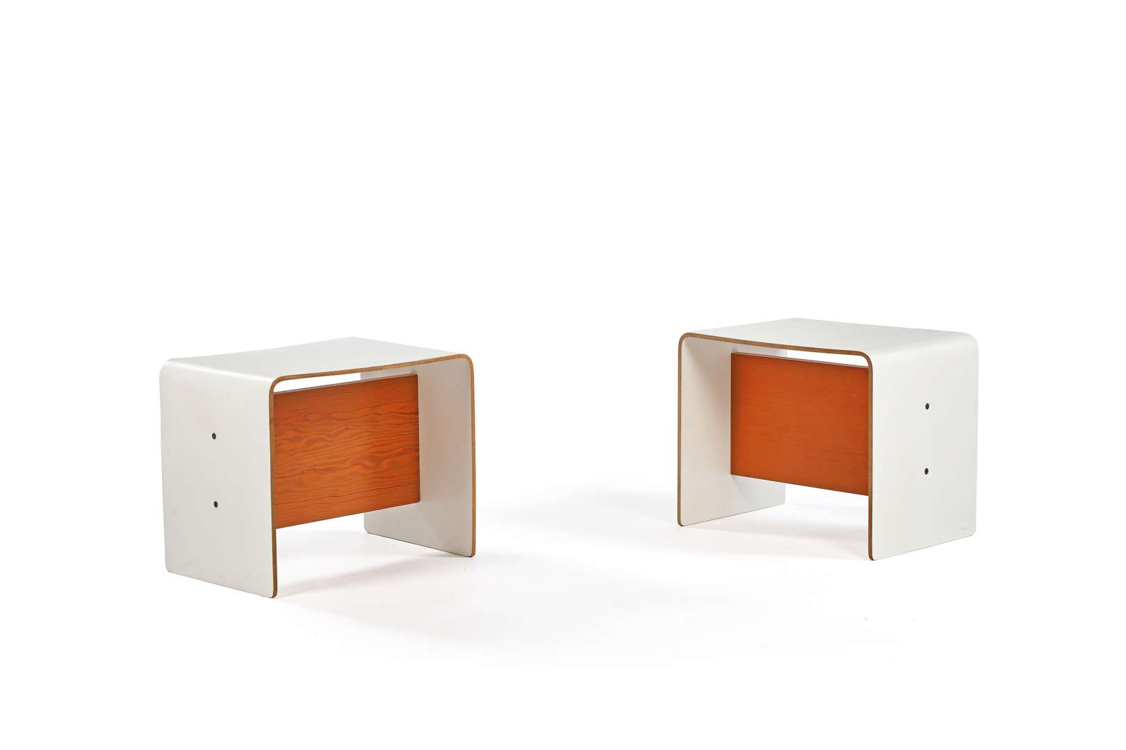 Structure en contreplaqué courbé recouvert de stratifié blanc, enserrant une tablette interne en bois de placage.
