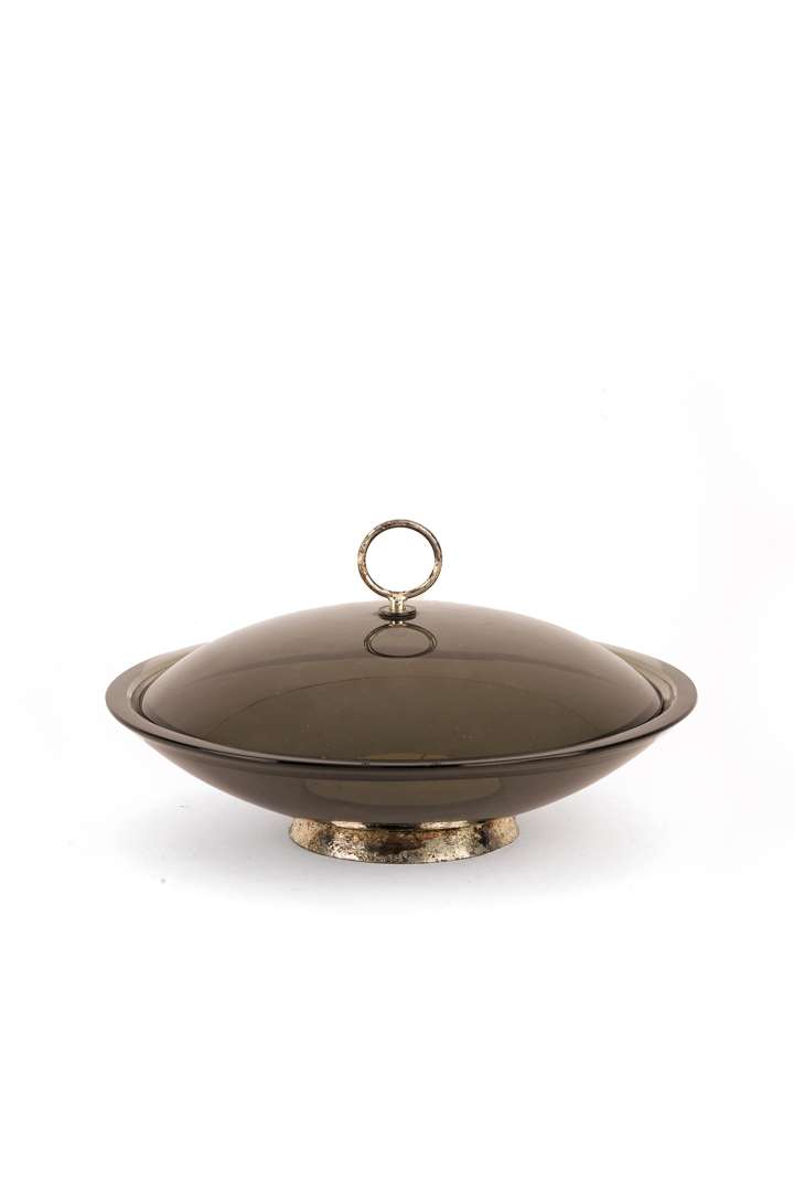 En verre fumé, prise supérieure circulaire et talon en métal chromé.