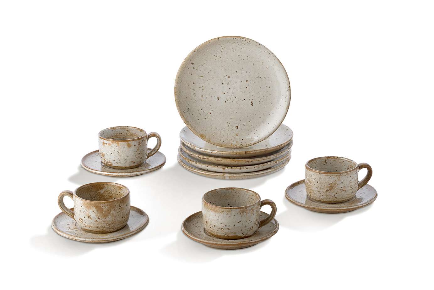 En grès, émail beige jaspé de brun, comprenant quatre tasses et leurs sous-tasses et cinq assiettes à dessert.