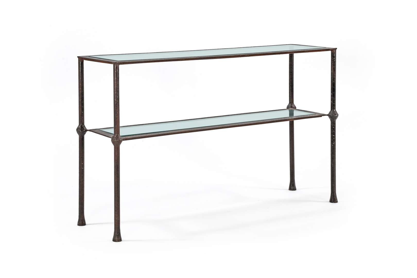 Structure en fer forgé à décor africaniste, soutenant deux plateaux rectangulaires en verre.
