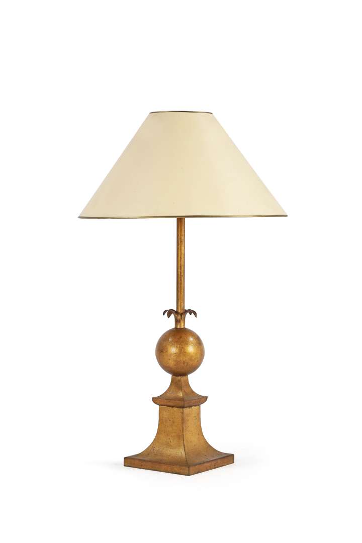 En tôle patinée à la feuille d’or, le fut orné d’une grenade stylisée, abat-jour en coton crème bordé d'un jonc doré.