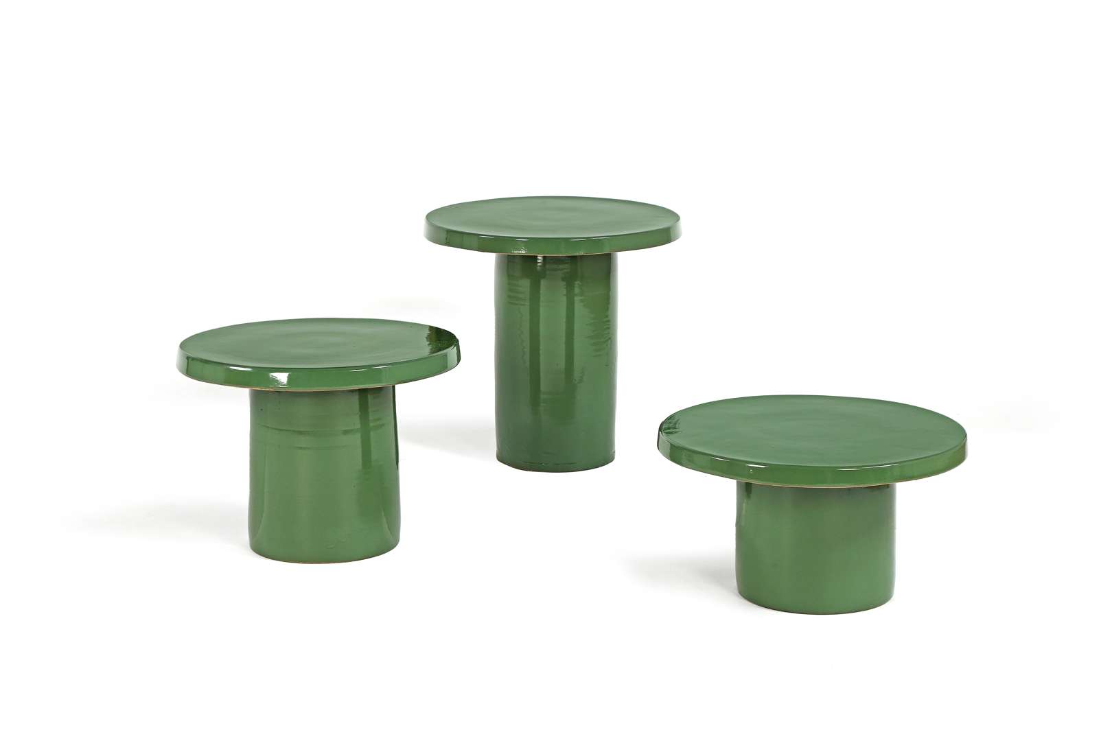En céramique émaillée vert, plateau circulaire reposant sur une base cylindrique de différentes hauteurs.