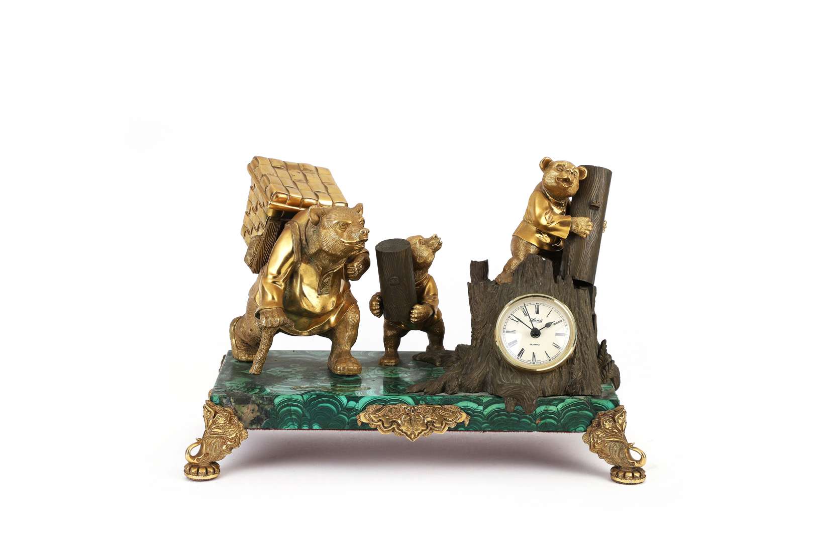 En bronze à patine dorée et brune, à décor d'ours et souche d'arbre, le mouvement signé Hermle, reposant sur une base rectangulaire en malachite.