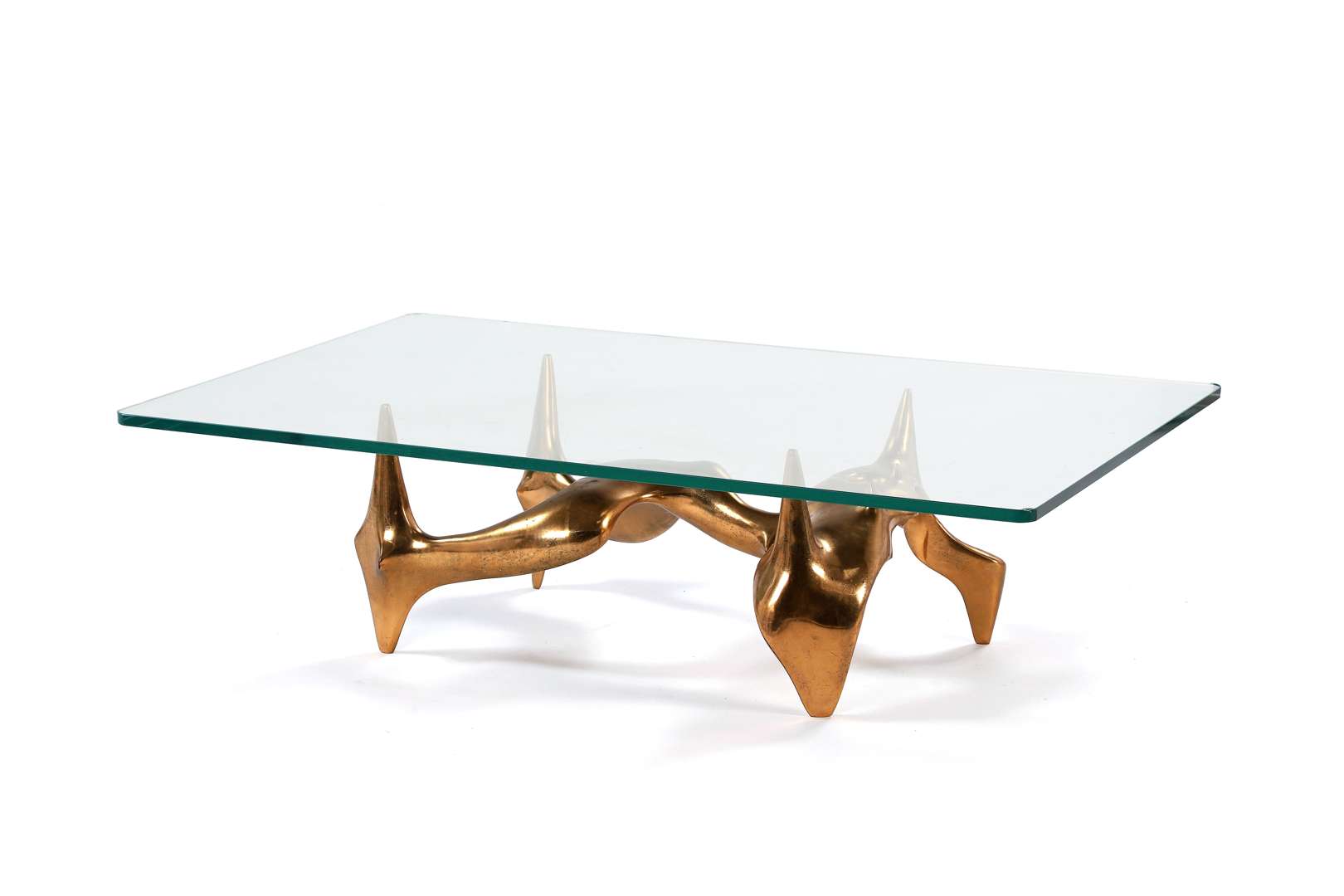 Piétement sculpture en bronze poli or, plateau rectangulaire en verre. Signature incisée ‘Roman’, numérotée 8/8.
