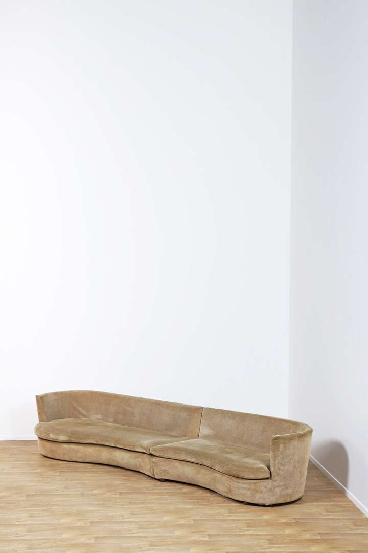 En deux parties, structure recouverte de velours chiné brun clair, chaque partie reposant sur un piétement quadripode cylindrique en ABS marron.