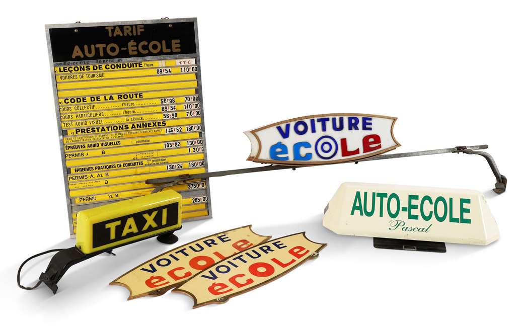 Lot de panneaux de toit auto-école et taxi, on joint un tableau des tarifs d'auto-école