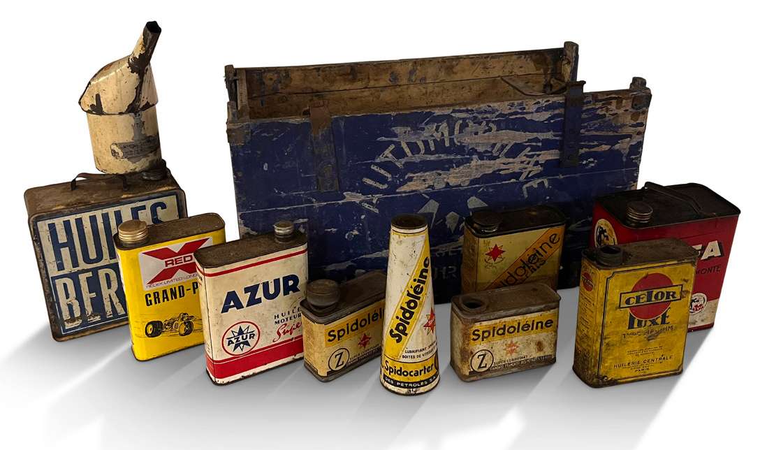 Lot comprenant une caisse en bois peint, 9 bidons : Spido, Celor, Red Grand Prix, Hafa, Huiles Berliet, Azur et 1 broc 40 X 71 X 35 cm env.