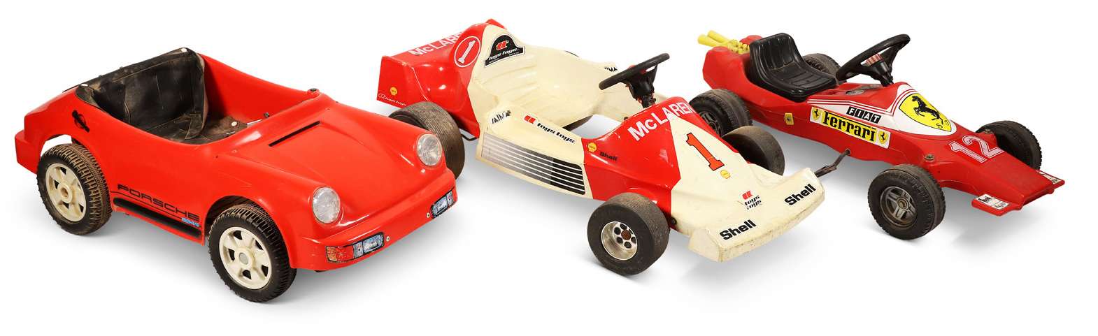 Lots de 3 voitures à pedales en plastique Toys-Toys - Formule 1 Mclaren - 110 X 55 cm env. Biemme - Porsche 911 - 100 X 50 cm env. Formule 1 Ferrari - 100 X 50 cm env.