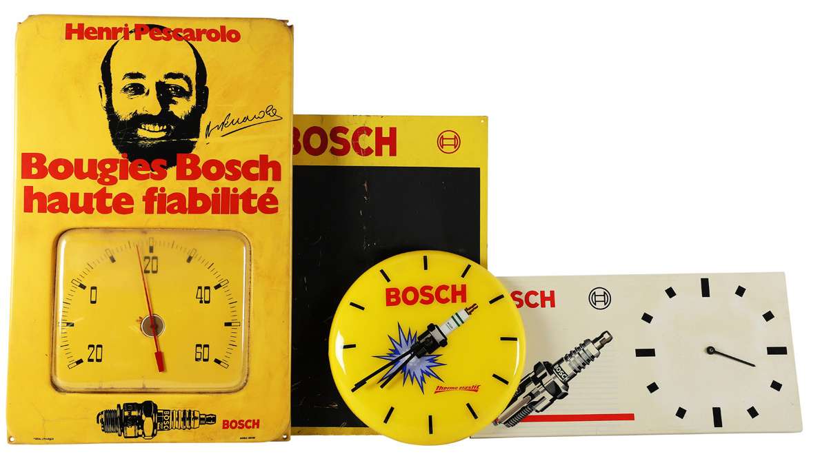 Lot comprenant un thermomètre Ideal en plastique Henri Pescarolo , bougie Bosch haute fiabilité (quelques fissures), 2 pendules en plastique et une plaque en tôle lithographiée 65 X 42 - 50 X 37 - 25 X 50 - Diam : 30 cm env.