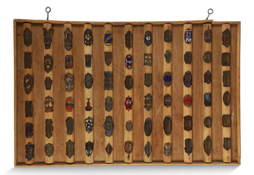 Lot de 66 plaques de cadre fixées sur panneu de bois : Sorgand, Onoto, Griffon, Ougla, Clement, Naumann, Saver, Aiglon, Hirondelle, Ravat, Nilmelior, Koehler Escoffier, Terrot, Scintille, Selco, Confort, Mag, Unter, Peugeot, Francis Pelissier, Boehme, Badenia, Arly, Prester, Monet Goyon, Wonder, Raleigh, Liberia, Daring, Dural, Rey, Muller, Triomphus, Dilecta le Blanc, Magnat Debon, Davy, Le Rêve, Radior, Calia, Nobilis, Kirsch, Vogesia, Jean Sport, lapebi, Derby, Favor, Montagnard, Terroir