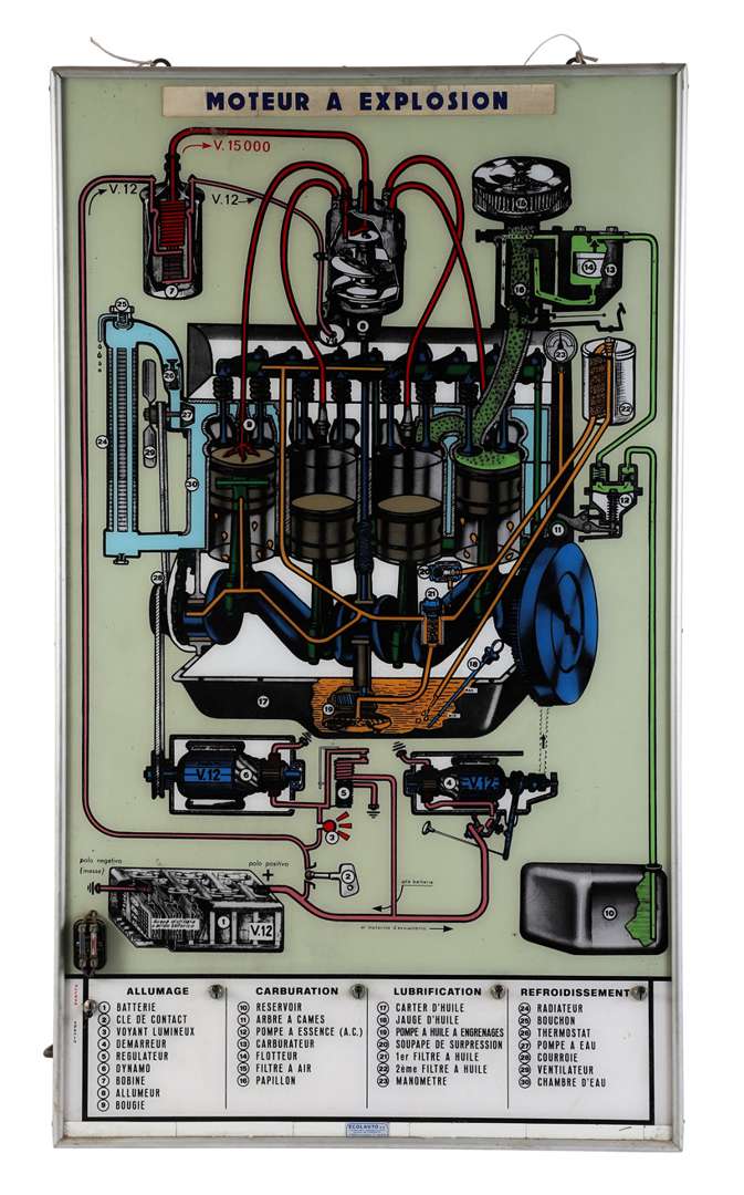 Tableau pédagogique lumineux montrant le fonctionnement du moteur à explosion, fonctionnel Ecolauto SA 110 X 64 X 11 cm env.