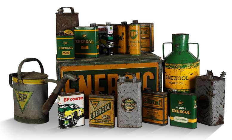 Lot comprenant une caisse en bois peint avec 2 tôles lithographiées, 14 bidons et 1 arrosoir 42 X 70 X 36 cm env.